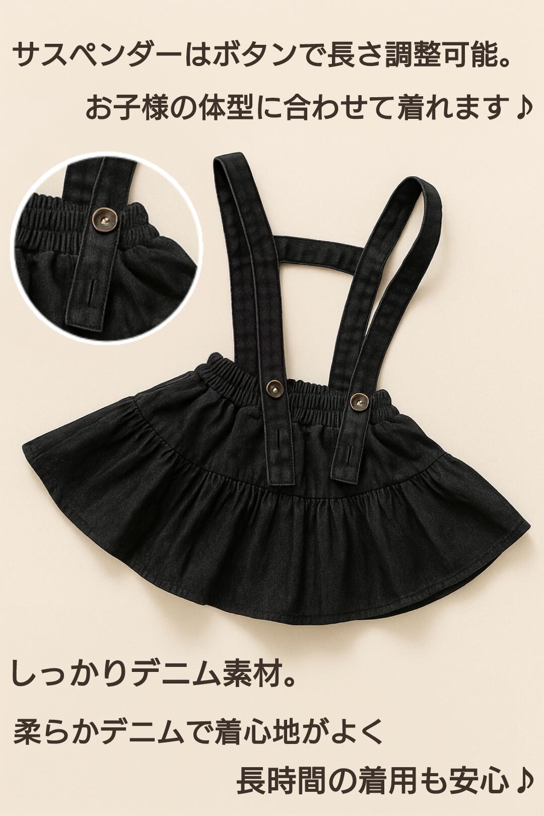 上品でかわいい「サスペンダーデニムスカート」です。