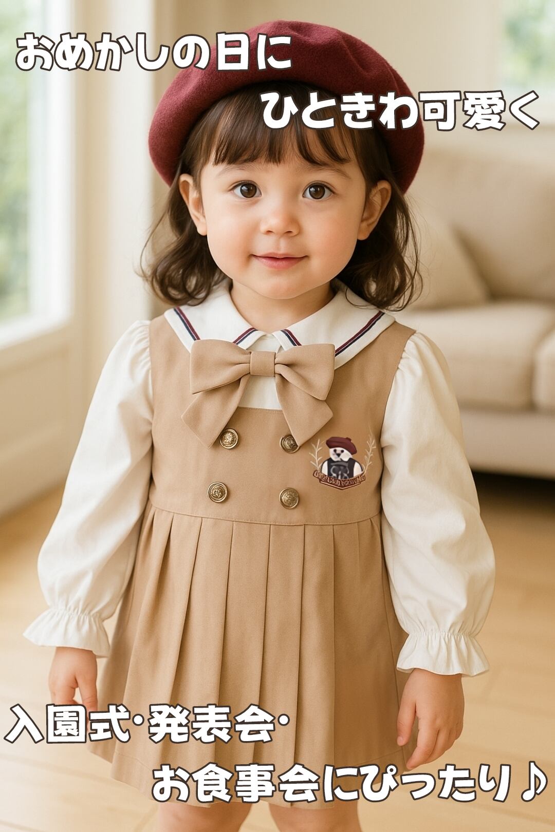 【新品】 ベビー 女の子 フォーマル 長袖 セーラー風 リボン お出かけ ベージュ
