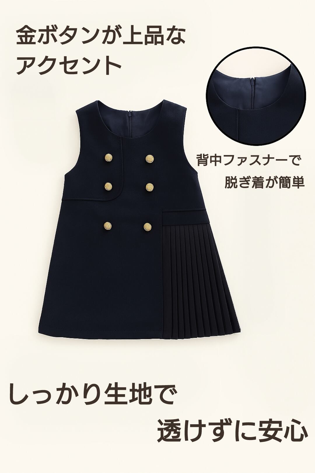 ワンピースもシンプルなAラインのノースリーブワンピースで後ろファスナータイプになっています。